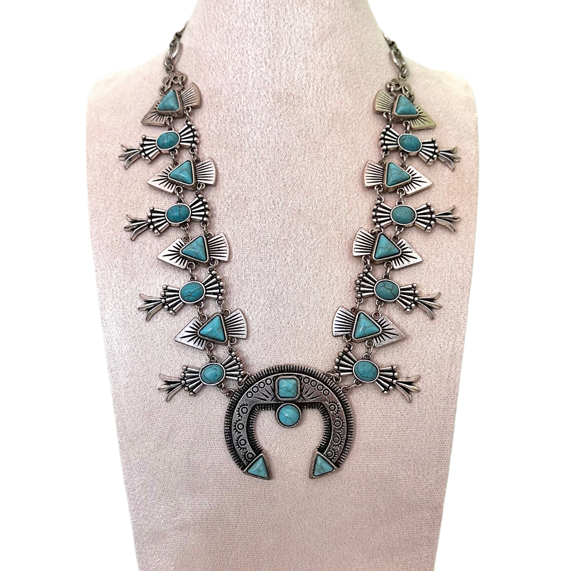 Bold lines, sacred shapes, and western soul. The Arrowhead necklace is a statement piece with purpose. Featuring striking faux turquoise stones framed in antique silver, this necklace layers arrowhead motifs with sunburst detailing, flowing into a powerful crescent pendant that anchors the design.