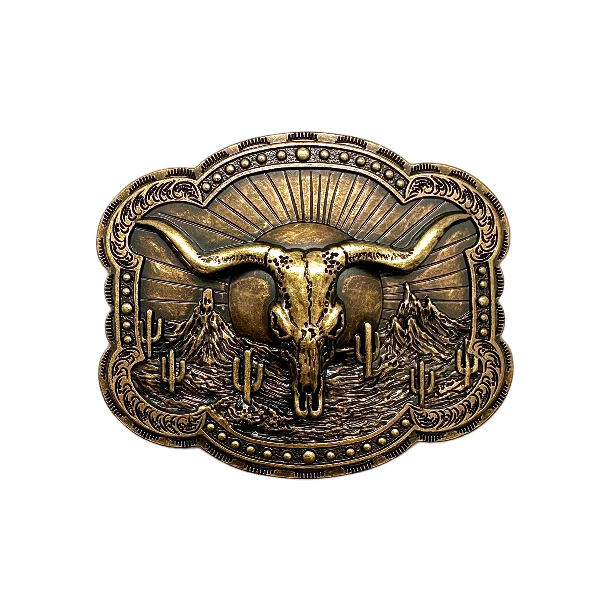 Bring a touch of the Wild West to your outfit with the bold Canyon Buckle. Crafted with a gleaming bronze-tone finish, it features a bold 3D longhorn skull centrepiece set against an intricately engraved backdrop.