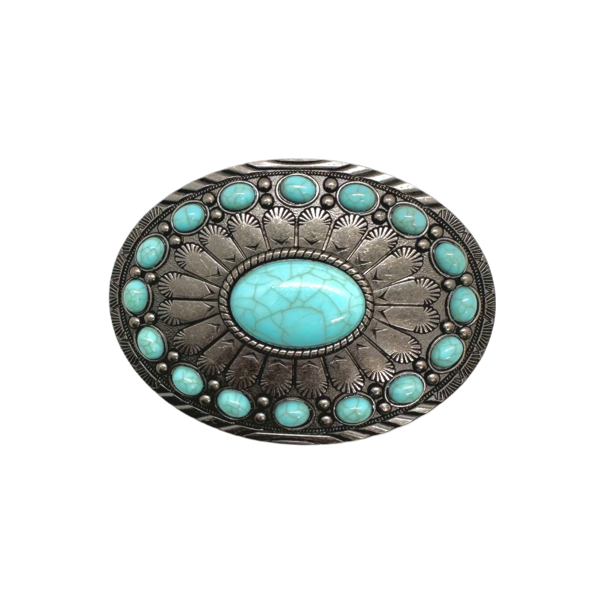 Add a bold Western statement to your outfit with this turquoise concho buckle. Featuring a stunning oval centrepiece surrounded by intricate silver engravings and accented with turquoise stones.