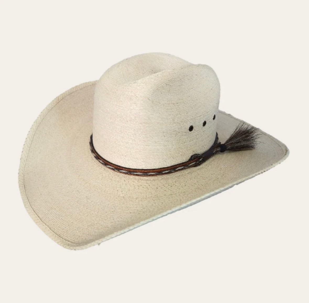 The Ironbark Straw Cowboy Hat is hand-crafted of straw and features a cattlemans crown, eyelet side vents and a wide brim. Finished with a leather interior sweatband and braided leather hat band with horsehair tassel.