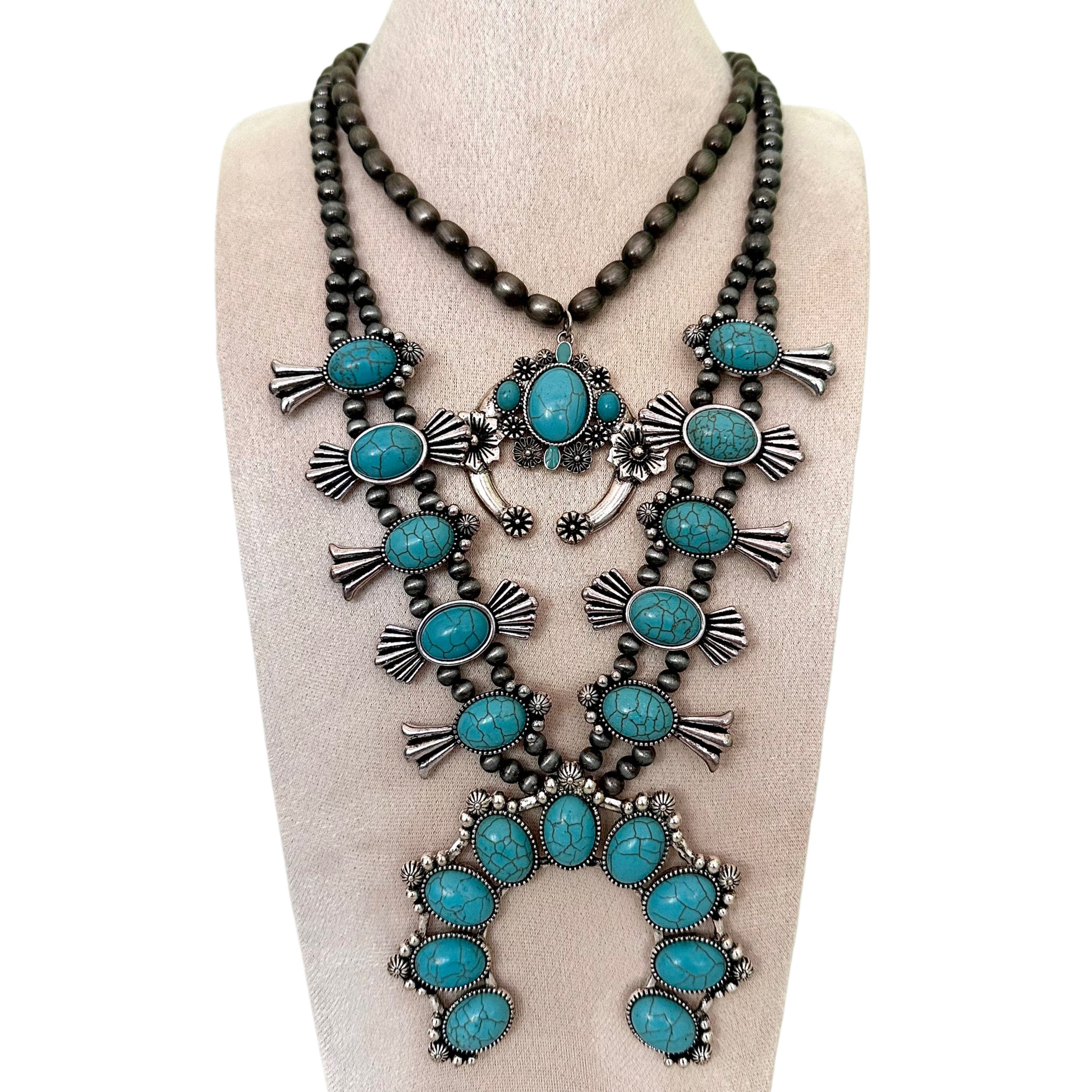 A true show stopper with undeniable western soul. This statement necklace features rich turquoise stones set in antique silver detailing, layered with classic squash blossom inspired motifs and beads for contrast and depth.