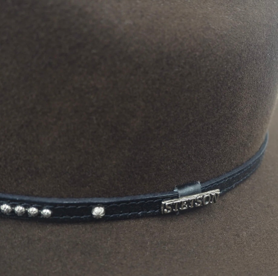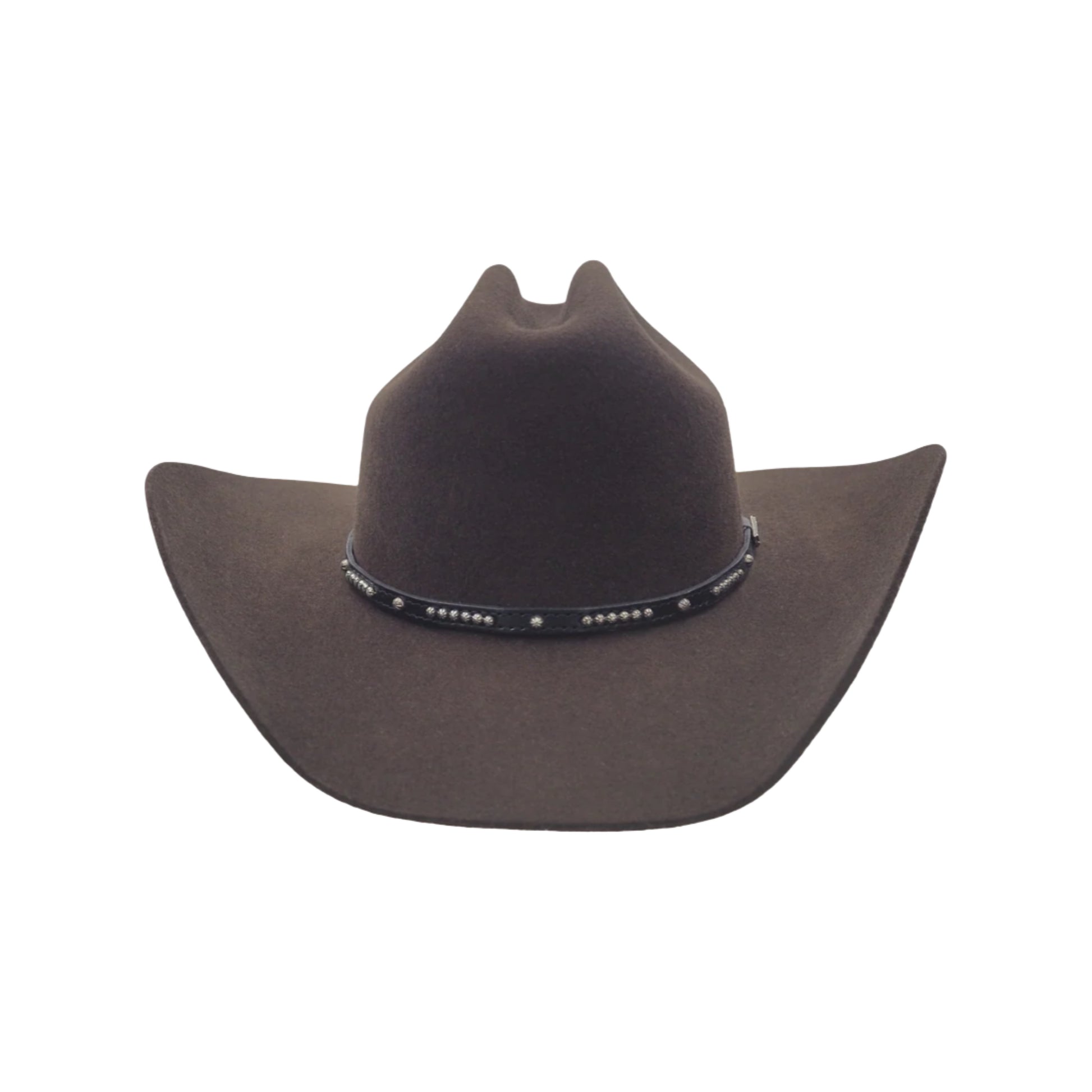 The Oregon Hat is constructed of Wool Felt and features a distinct pinch front crown and is finished with a silver accented leather hat band.