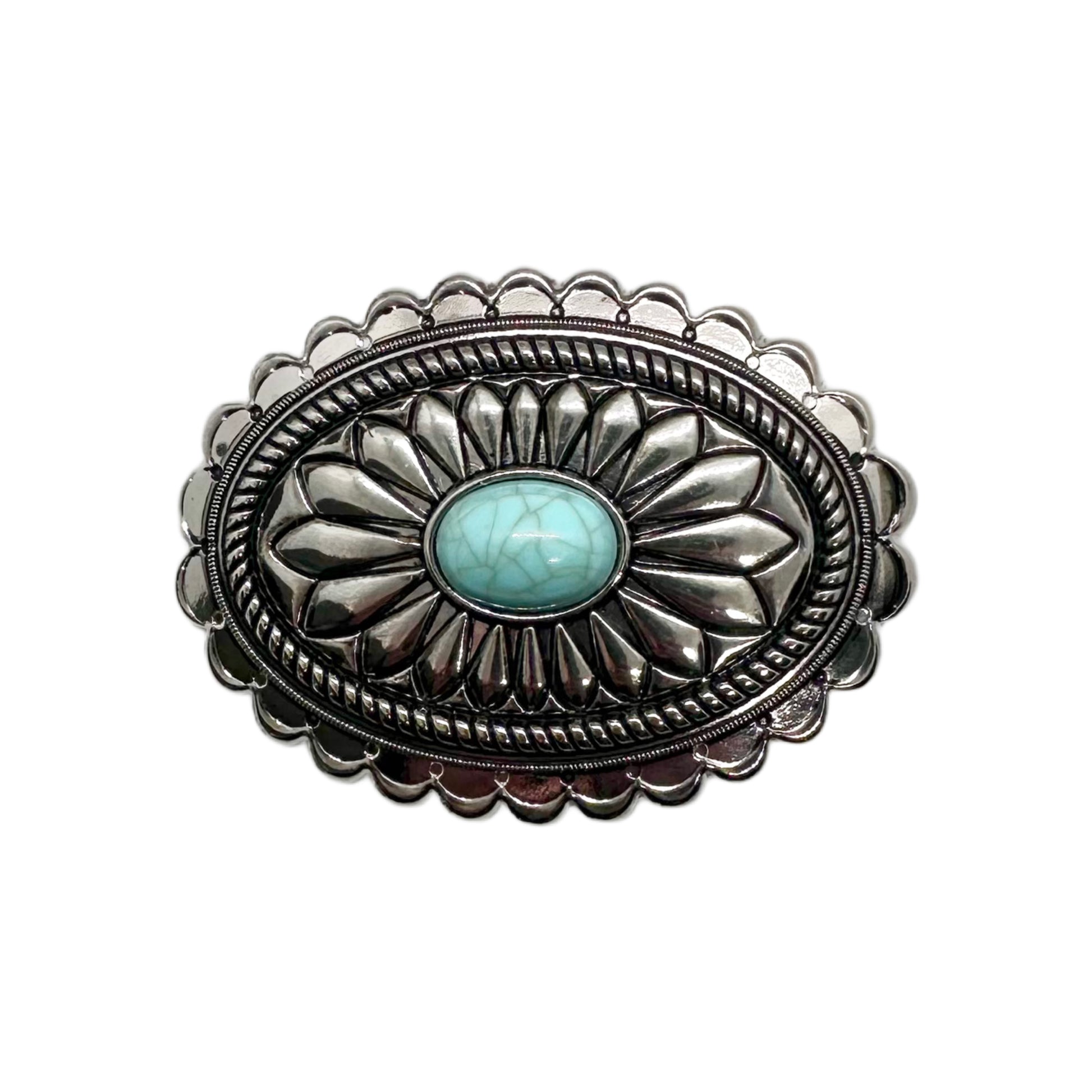 Add a bold Western statement to your outfit with this faux turquoise concho buckle. Featuring a stunning oval centrepiece surrounded by intricate silver engravings and accented with turquoise stones.