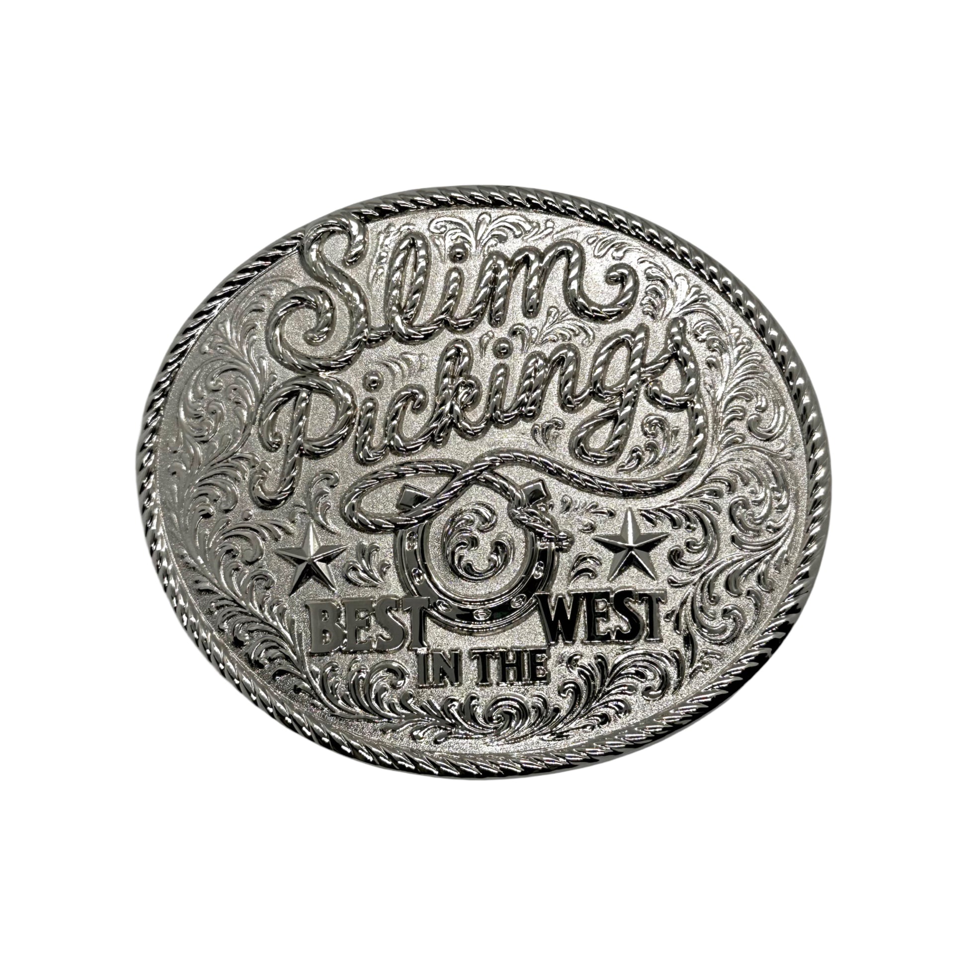 Add a touch of authentic Western flair to your look with our exclusive Slim Pickings engraved belt buckle.