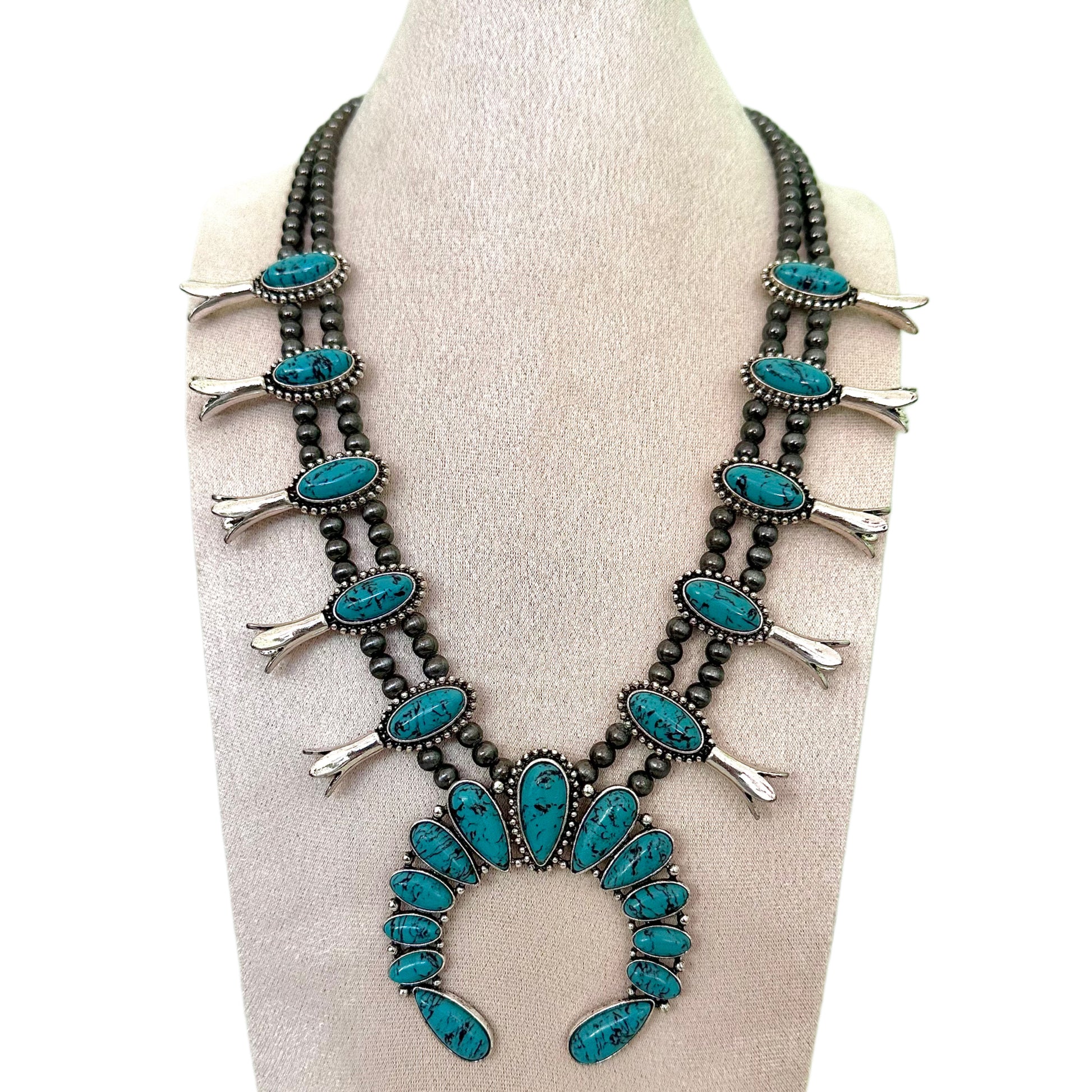 Channel timeless Southwestern elegance with the Carolina Turquoise Squash Blossom Necklace. Featuring striking turquoise stones set in detailed silverwork, this piece captures the spirit of country western heritage and bold feminine style.