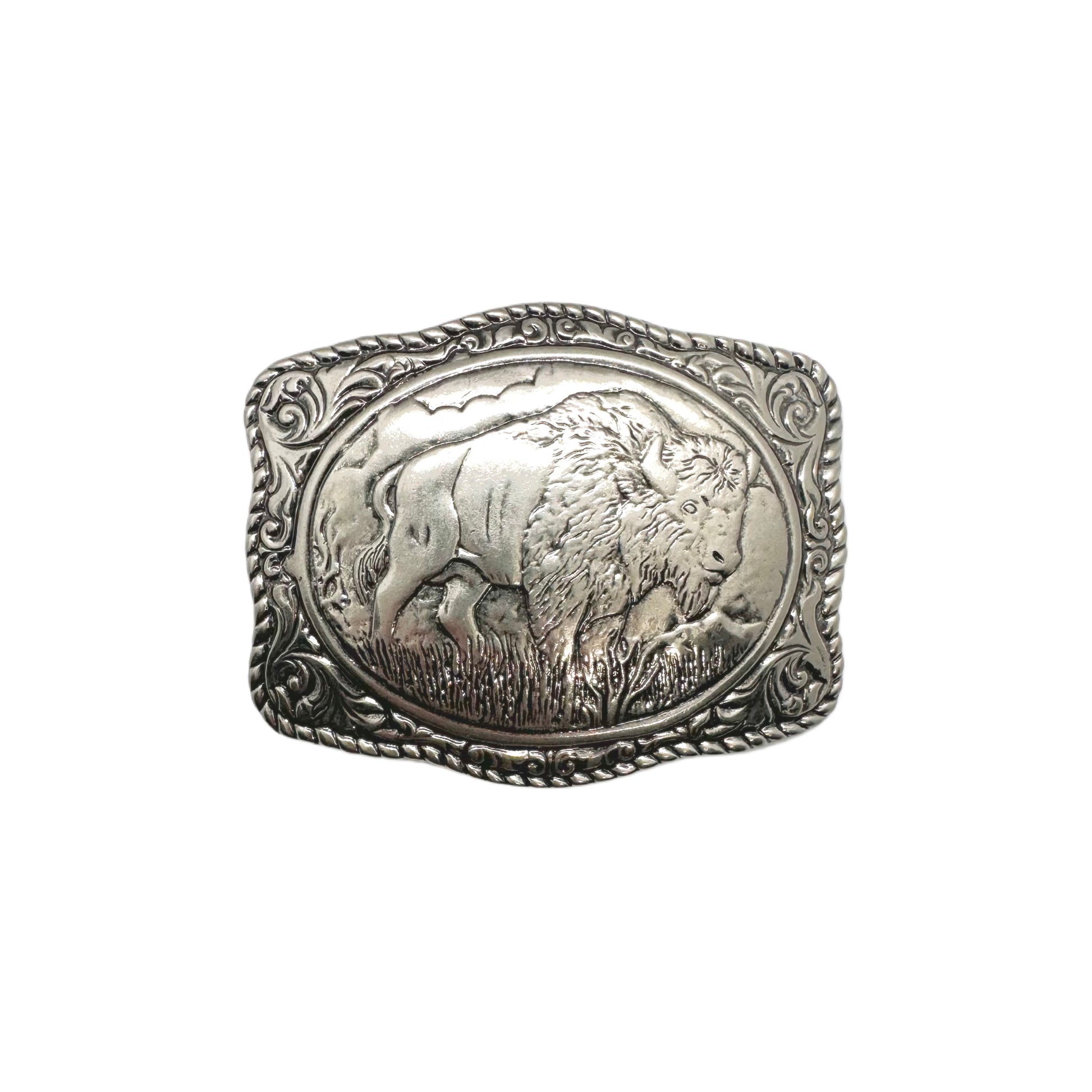 Bring the wild frontier to life with this boldly engraved buffalo buckle, a timeless piece that captures the raw spirit of the American West. Crafted in polished silver-tone metal, the intricate design showcases a powerful buffalo in its natural landscape, framed with ornate Western scrollwork for an authentic finish.
